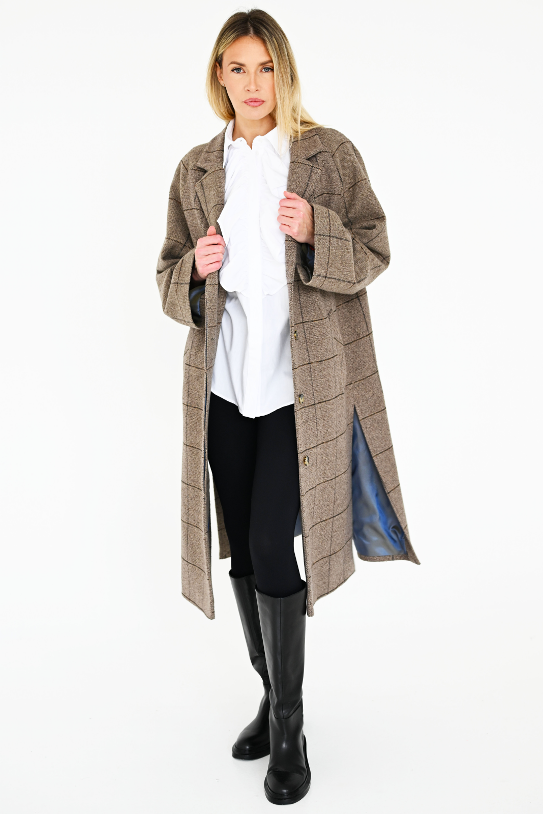 Midi length, wool cotton and viscose blend, soft and light fabric, with brighter windows that create a very beautiful and tasteful accent, and bring more life to the combination of clothes. Earthy colors that are basic and will easily fit into your wardrobe of various colors. The coat is midi length, so the bottom of the dress will not stick out. With pockets, raglan sleeves. The silhouette is loose - oversize, so you can wear a shirt and a thick sweater underneath - you will look just as beautiful. And the most important accent - slits, shorter on the sides, and on the back all the way to the top, this is reinforced for transportation, then you can leave it half-closed when wearing it, or loosen it, it is a truly eye-catching detail.