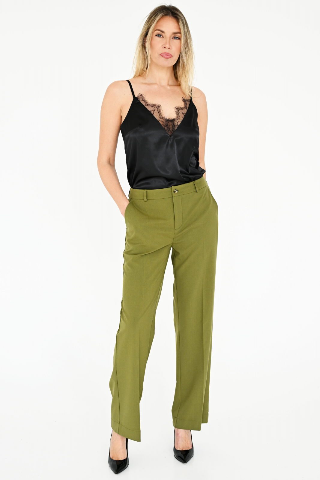 Klasikinės tiesaus kirpimo kelnės iš malonaus elastingo plokščio audimo viskozės mišinio audinio. Tiesaus silueto, su užtrauktuku ir sagomis. Audinys lengvai krentantis, ir ypatingai malonus prie kūno, turintis elastano - tad tikrai patogus dėvėti. Puikiai dera prie bet kokio aukščio avalynės. Dailiai apgula liemenį. Yra kišenės priekyje ir nugaroje. Puikiai tinka dėvėti ne tik prie švarko, bet ir su palaidinėmis megztiniais ar džemperiais.