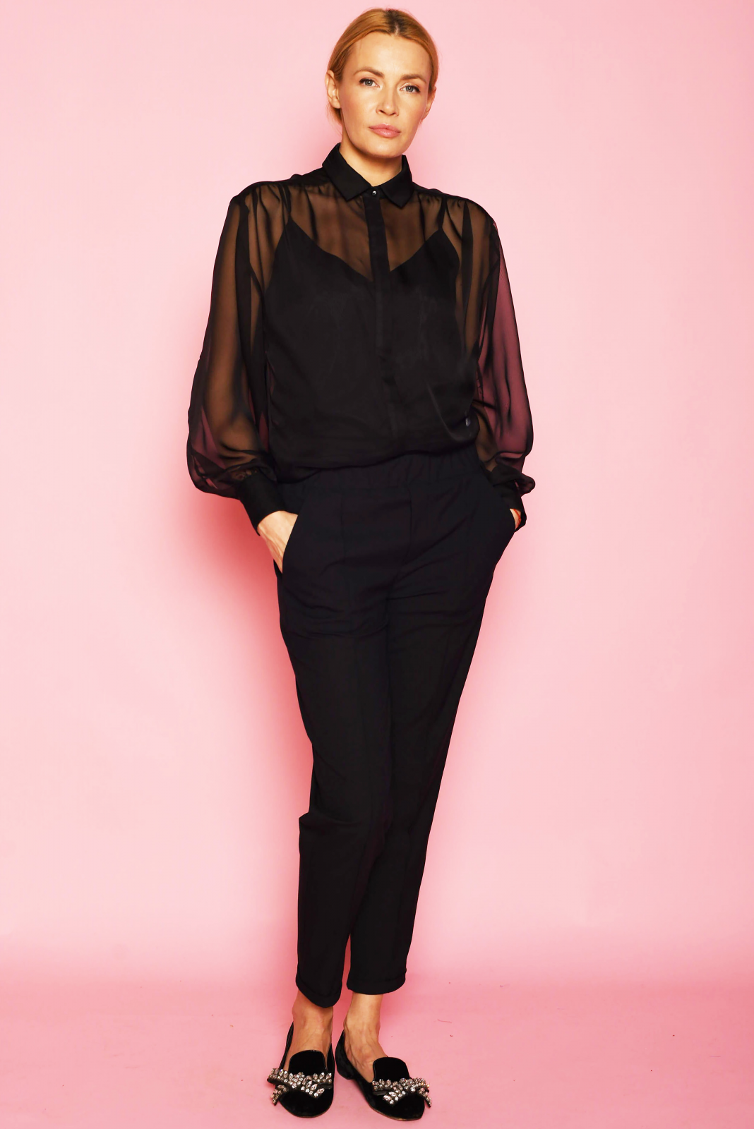 Švelnaus šifono palaidinė užsegama priekyje. Laisva padidinta, su laisvomis krentančiomis rauktomis rankovėmis ir nugaros detale. Švelnutis skaidrus šifonas.
