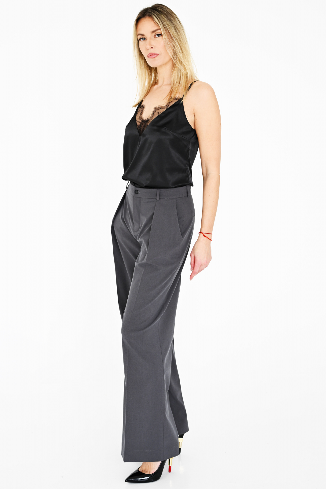 Viskozės su elastanu audinio, tiesaus kirpimo, plačios apačioje kelnės su kloste viršuje. Apgula liemenį, priekyje kelnės užsisega sagomis ir užtrauktuku. Yra kišenės šonuose. Nugaroje kišenių imitacija. Audinys labai gražiai krenta ir kelnės atrodo labai elegantiškai. Puikiai dera prie bet kokio aukščio avalynės, aukštakulnių ar žemakulnių batelių.