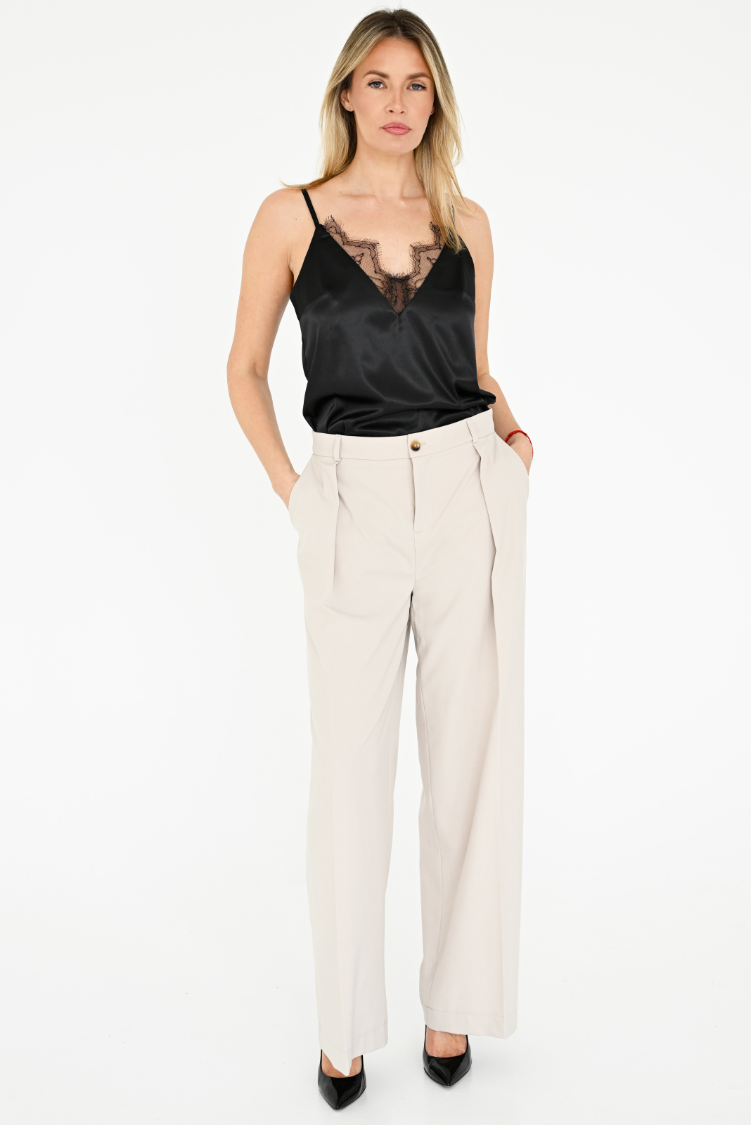 Viskozės su elastanu audinio, tiesaus kirpimo, plačios apačioje kelnės su kloste viršuje. Apgula liemenį, priekyje kelnės užsisega sagomis ir užtrauktuku. Yra kišenės šonuose. Nugaroje kišenių imitacija. Audinys labai gražiai krenta ir kelnės atrodo labai elegantiškai. Puikiai dera prie bet kokio aukščio avalynės, aukštakulnių ar žemakulnių batelių.