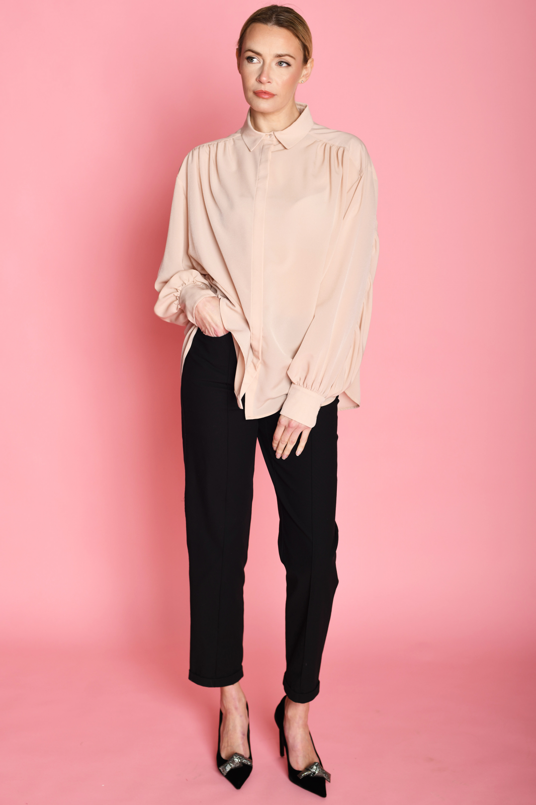 Švelnaus plonyčio krepo palaidinė užsegama priekyje. Laisva padidinta, su laisvomis krentančiomis rauktomis rankovėmis ir nugaros detale.