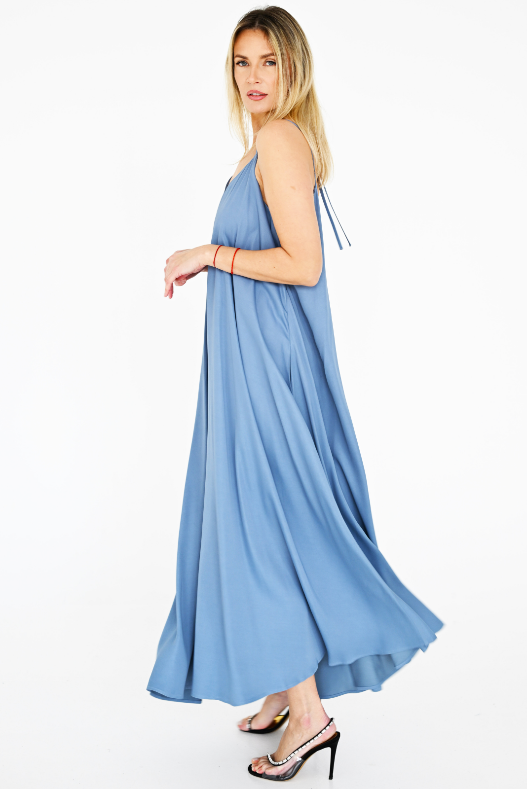 Reguliuojamų petnešėlių Maxi viskozės audinio dirbtinio šilko tipo suknelė, nuostabaus sunkaus audinio kritimo ir be galo švelnaus pojūčio prie kūno. Petnešėlės yra suvarstomos ir surišamos nugaroje, tad priekio iškirptės ir pažastų gylį ir suknelės ilgį galite lengvai reguliuoti. Su kišenėmis. Audinys kvėpuojatis, tad tik ir vasarą ir vėsiu metų laiku, nes yra tankus ir neperpučiamas. Puikiai dera su diržu, taip pat su megztuku ar džemperiu. Puikiai atrodo ir ant trikotažinių marškinėlių. Kaitaliokite detales ir gaukite daugybę suknelės dėvėjimo variacijų!