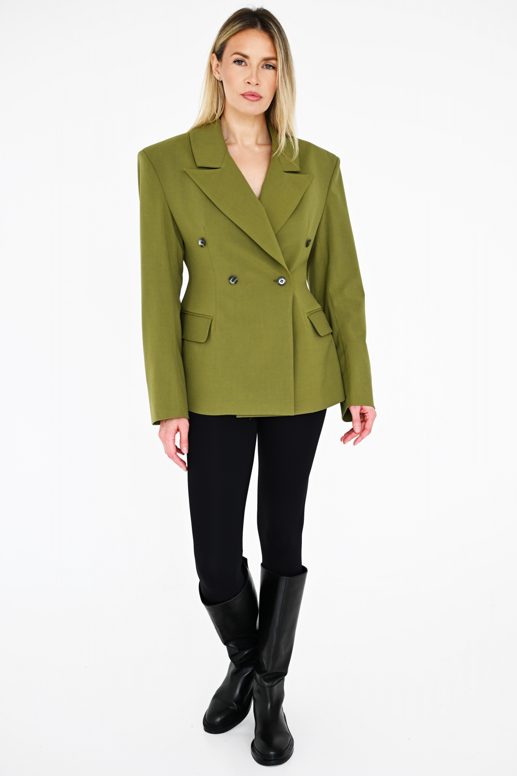 Plačiais išreikštais pečiais švarkas, Liemenuotas, su laisvumu klubuose, dvieilio užsegimo švarkas iš kostiuminio audinio viskozės pagrindu, kuris nereikalauja priežiūros ir nesiglamžo. Su pamušalu, labai patogus dėvėti. Su kišenėmis, užsegamas dvejomis eilėmis sagų. Puikiai dera su kelnėmis, sijonu ar šortais, ir ypatingai su tympomis ir jojiko tipo auliniais batais. Kontrastinis pamušalas dar labiau pagyvina švarką, taip pat jį galima dėvėti atlenktais rankogaliais.