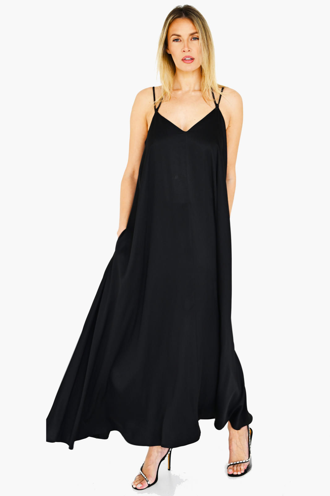 Reguliuojamų petnešėlių Maxi viskozės audinio dirbtinio šilko tipo suknelė, nuostabaus sunkaus audinio kritimo ir be galo švelnaus pojūčio prie kūno. Petnešėlės yra suvarstomos ir surišamos nugaroje, tad priekio iškirptės ir pažastų gylį ir suknelės ilgį galite lengvai reguliuoti. Su kišenėmis. Audinys kvėpuojatis, tad tik ir vasarą ir vėsiu metų laiku, nes yra tankus ir neperpučiamas. Puikiai dera su diržu, taip pat su megztuku ar džemperiu. Puikiai atrodo ir ant trikotažinių marškinėlių. Kaitaliokite detales ir gaukite daugybę suknelės dėvėjimo variacijų!