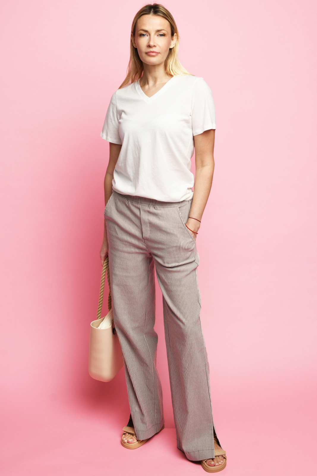 Minkštos tamprios medžiagos su linu kelnės, plačios ir tiesios, gražiai krentančios į apačią. Apgula liemenį gumos dėka, su dekoratyviniais raišteliais. Yra kišenės. Nugaroje kišenių imitacija. Be galo jaukios ir patogios.