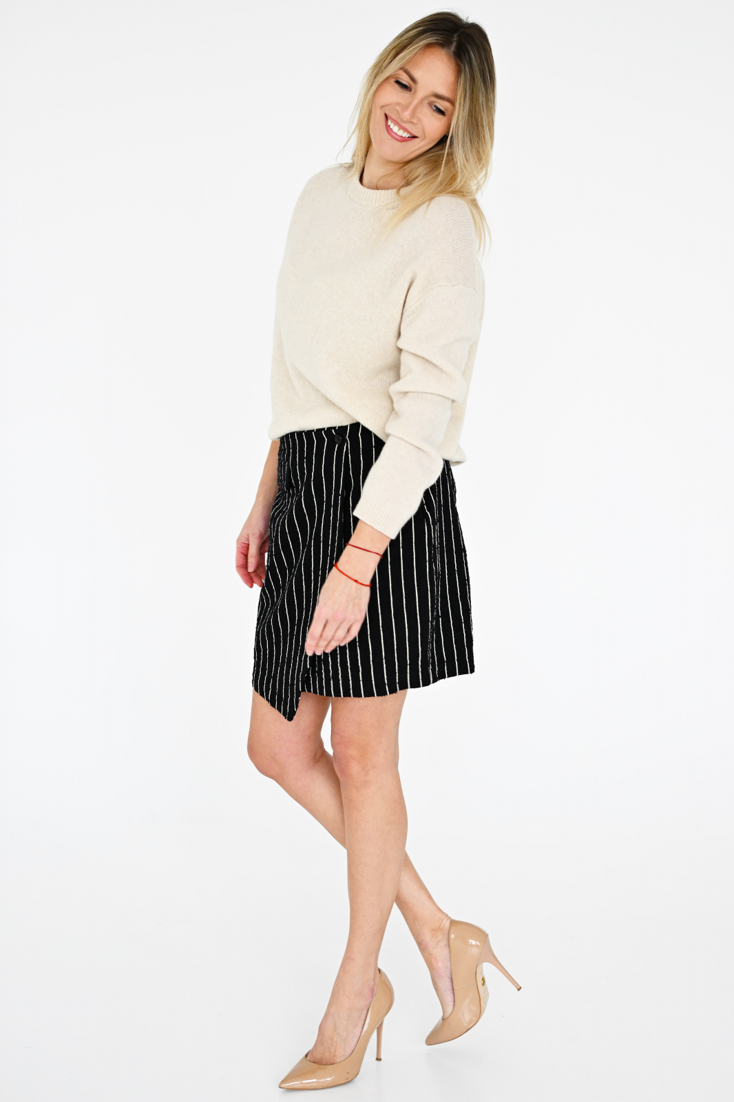 JUPITER: Šiltesniuo juodo su balkšvais dryželiais medvilnės audinio, bukle paviršiaus susiaučiamas sijonas su pamušalu. Priekio detalė asimetriška, dekoruota nefunkciniu antkišeniu. Puikiai prisitaiko prie kūno linijų dėl užkeičiamų priekio detalių ir suteikia leisvę judėti. Tinkamas dėvėti ne tik pavasarį ar vasarą bet ir žiemą.