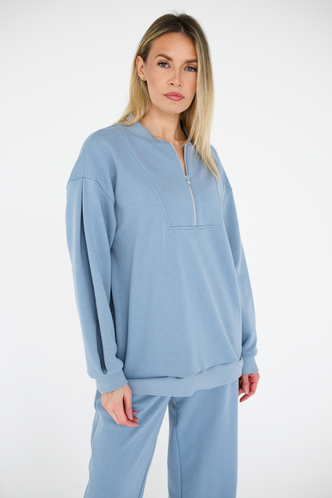 Minkšto tampraus trikotažo džemperis su klostuotomis rankovėmis, besibaigiančiomis tampriu mezginiu. Priekis prasisega užtrauktuku, papildomai suteikiant laisvės dėvėjimui ir atsivėsinimui. Yra su kilpelėmis vidinėje pusėje, taigi tinkamas dėvėti visais metų laikais.