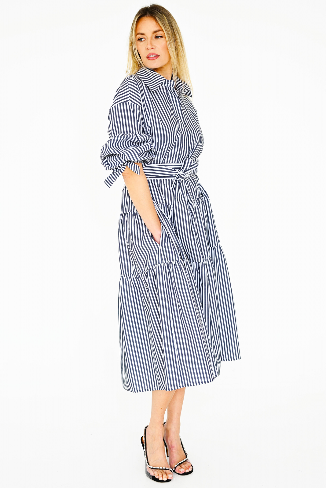 Viena suknelė dėvima kaip keturios skirtingos suknelės jos transformacijų dėka. Ilgos rankovės apačioje susiriša banteliais, tad lengvai galite reguliuoti jų ilgį. Suknelė galite dėvėti ir be diržo, laisvą, ypač karštuoju sezonu norisi laisvumo ir ventiliacijos. Kai norisi ir reikia pasitempti, susijuoskite ją kelis kart prailgintu diržu, ir gausite visai kitą, dailią ir elegantišką marškininio užsegimo viršuje, suknelę. Su ja galite vykti tiek į miesto atostogas, dėvėti kasdienos veikloje, nešioti biure, ar vakaro susitikimuose.