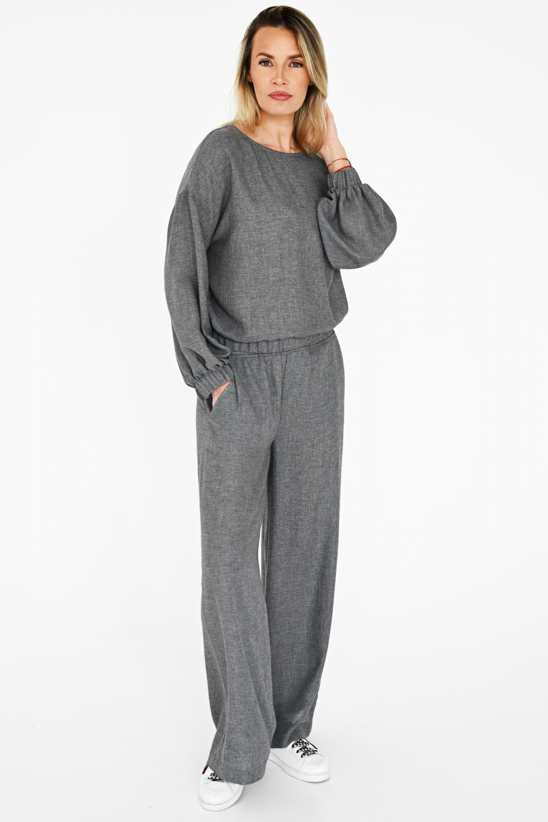 PILER: Natūralaus nuostabiai krentančio viskozės su vilna audinio kelnės, plačios ir tiesios, gražiai krentančios į apačią. Apgula liemenį gumos dėka. Be galo jaukios ir patogios, nevaržančios judesių. Audinys lengvas ir prisitaikantis prie temperatūros, ventiliuojamas.